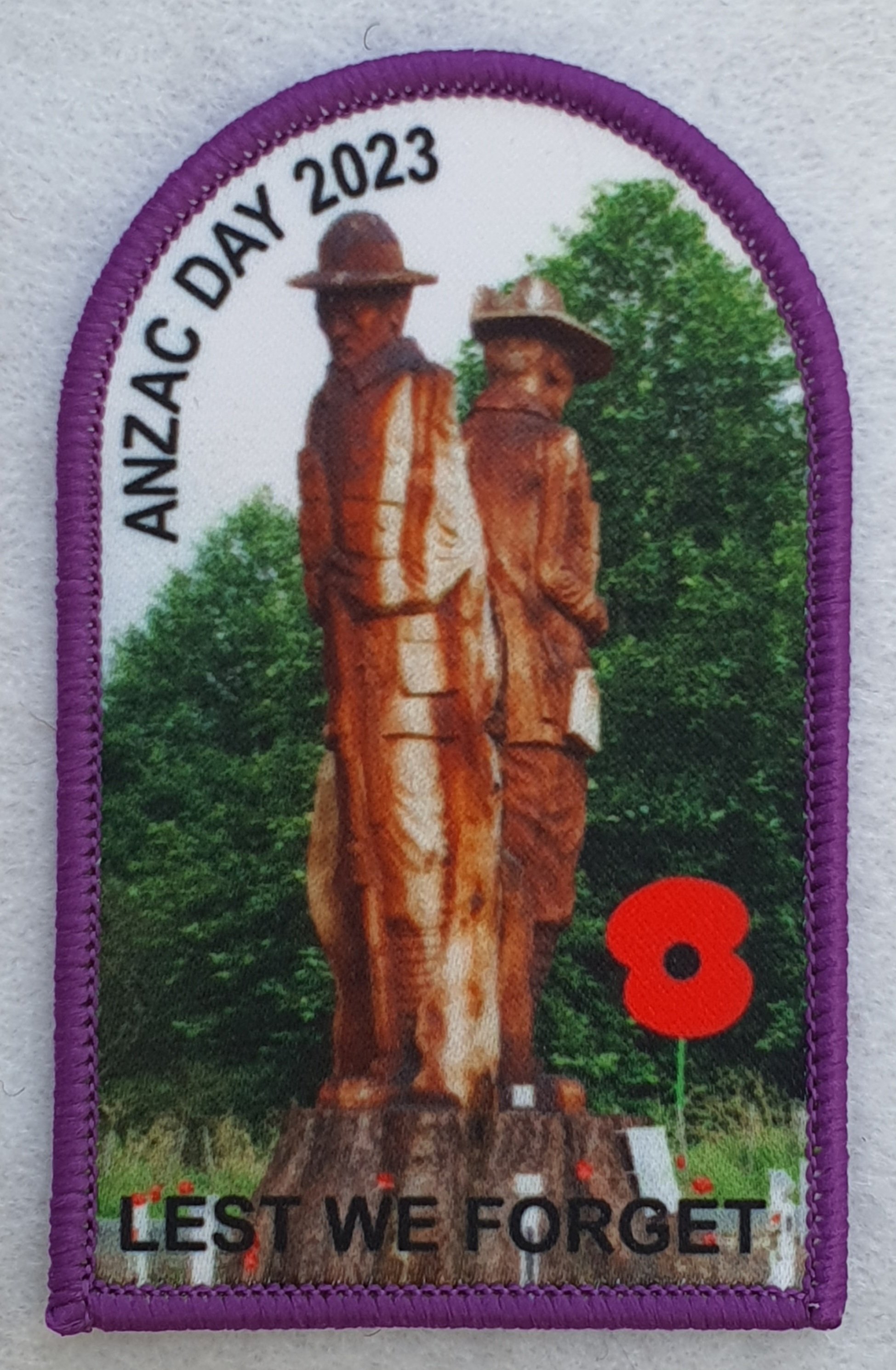 A different design again features on this year’s Anzac Day badge, which is printed - a picture of a new monument carved from a huge Redwood tree. This memorial was unveiled late in 2022 and is located at Rissington in the Hawkes Bay and features a pair of soldiers (one an Australian and one a New Zealander).